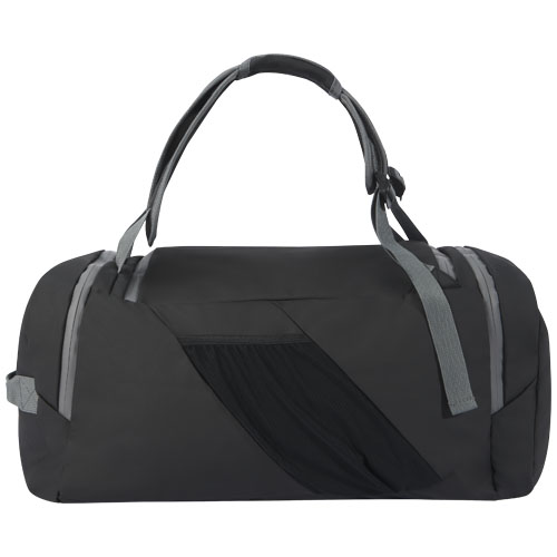 Waterbestendige 2-in-1 duffelrugzak van GRS-gecertificeerd gerecycled materiaal, inclusief de ritsen. Voorzien van een ruim hoofdvak met U-vormige opening voor gemakkelijke opslag en toegang, twee zijzakken met ritssluiting (waaronder een compartiment voor schoenen), een voorvak met ritssluiting, een waterzak van mesh aan de achterkant en reflecterende biezen voor zichtbaarheid. Deze tas kan op 3 verschillende manieren worden gedragen: Met de hand, over de schouder, of als rugzak met zijn gewatteerde en verstelbare schouderbanden. De gerecyclede GRS-materialen omvatten de hoofdstof, voering, banden en ritsen. Capaciteit: 35 liter. PVC-vrij.